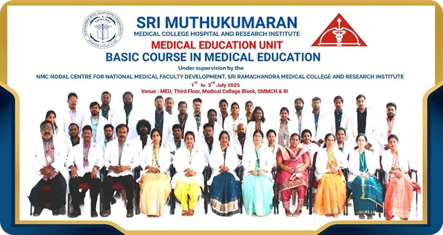 Established in 2011, the Medical Education Unit (MEU) at Sri Muthukumaran Medical College Hospital & Research Institute (SMMCHRI) is dedicated to fostering educational excellence and innovation. As an integral part of the institution and functioning as an NMC Nodal Centre for Faculty Development under the support of Sri Ramachandra Medical College, the MEU conducts critical programs such as Revised Basic Course Workshops (RBCW), Attitudes, Ethics and Communication (AETCOM) training, and Curriculum Implementation Support Programmes (CISP) for MBBS Phase I and II faculties. It consists of a committed team of faculty with advanced qualifications like Advanced Course in Medical Education (ACME) and Master of Philosophy (M.Phil.) in Health Professions Education, focused on enhancing teaching quality and curriculum delivery aligned with Competency- Based Medical Education (CBME) introduced nationally from 2019.